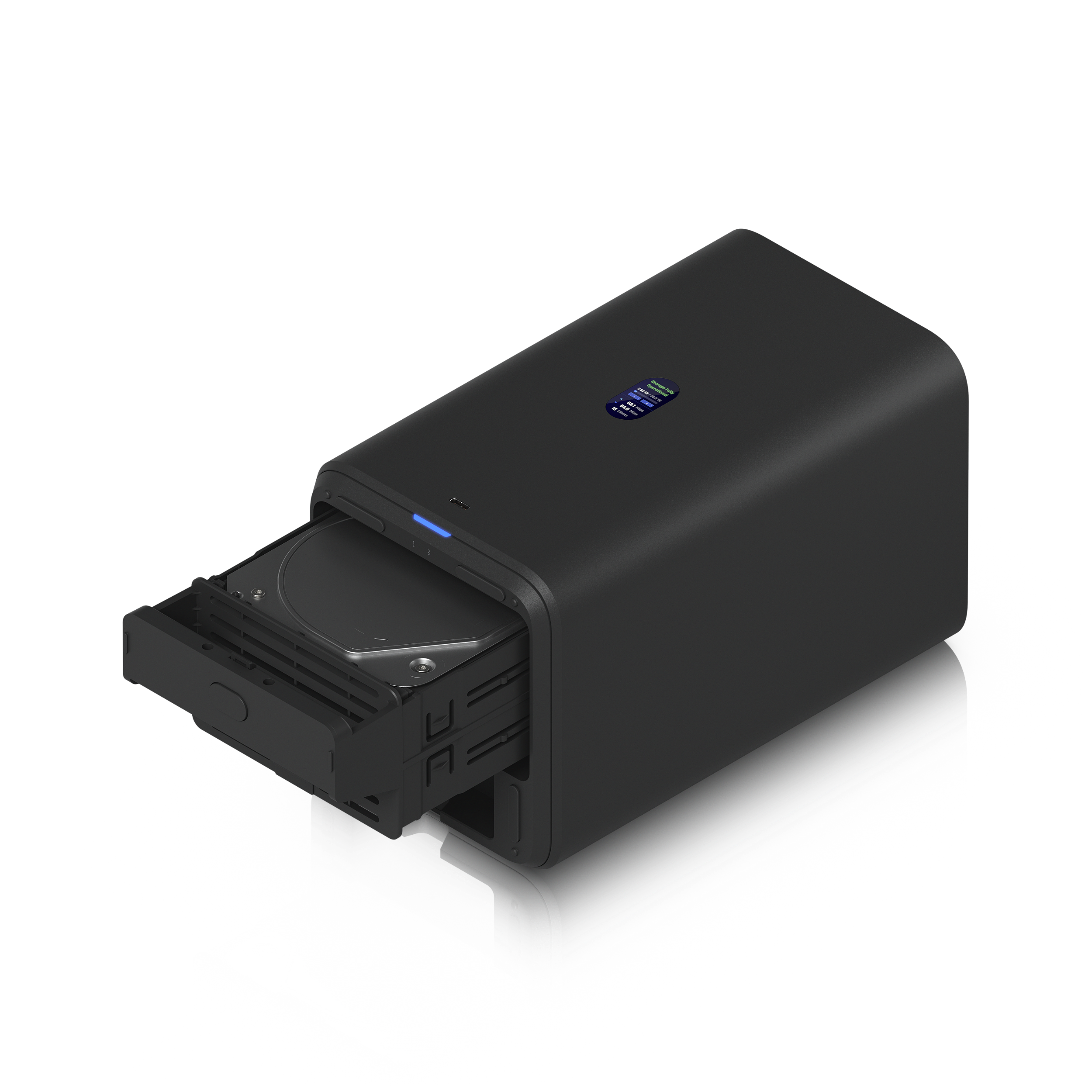 Armazenamento conectado em rede UniFi Network com (2) baias para HDD de 3,5", rede de 2,5 GbE, conectividade USB-C e um adaptador PoE++ incluído, tudo em um formato compacto.